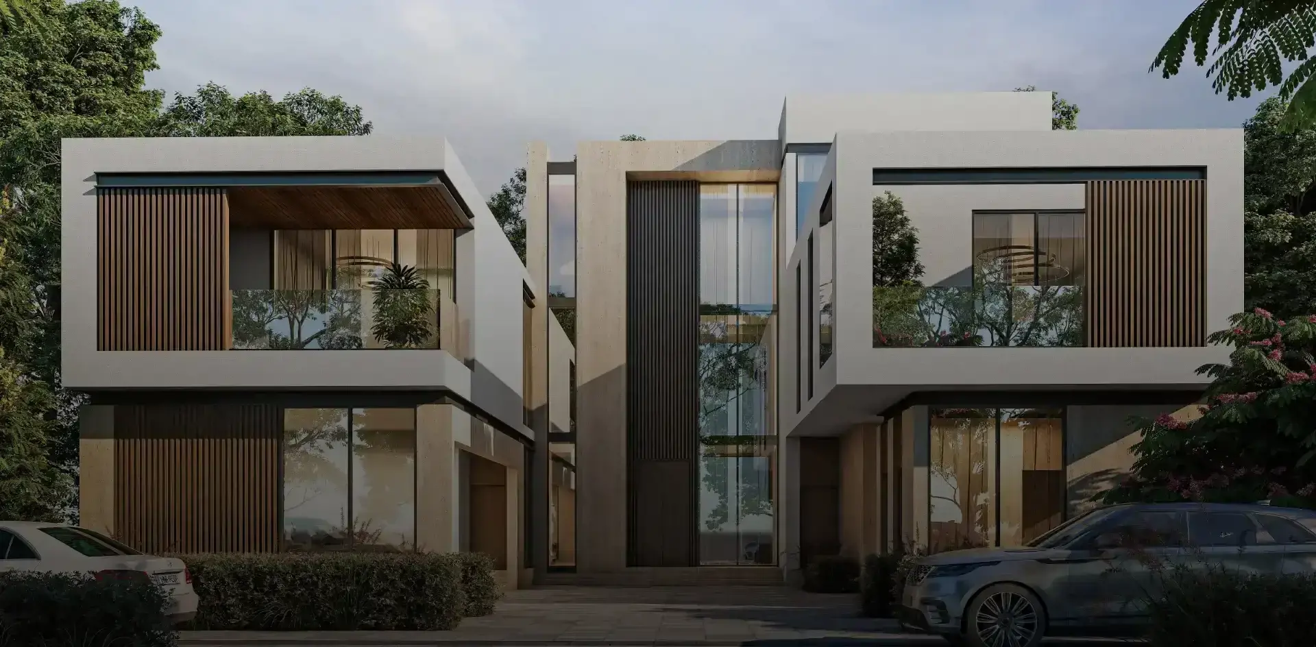 A luxurious residence housing exquisite villas within a lush gated community. Features include bouldering walls, clusters of exotic flowers, and tree-lined walkways. Each villa starts at 4900 sq. ft.